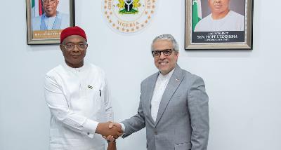 On 8 December 2025 H.E. Mr. Mahdavi Raja Ambassador of the Islamic Republic of Iran to Nigeria held talks with H.E. Hope Uzodimma Governor of Imo State. The meeting focused on the development of bilateral and international trade cooperation between the public and private sectors as well as the expansion of subnational (state-level) cooperation.