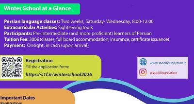 Saadi Foundation offers a persian leanguage learning program and a two week teacher education program from January 18 to February 3, 2026. for further information click on the link below: https://saadifoundation.ir
