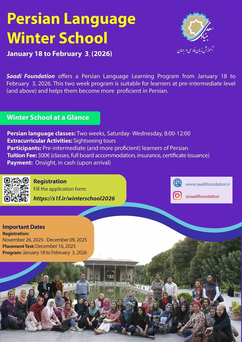 Saadi Foundation offers a persian leanguage learning program and a two week teacher education program from January 18 to February 3, 2026.
