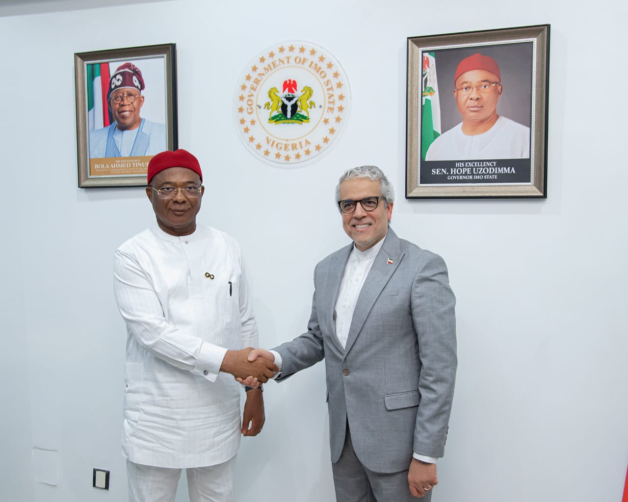 در تاریخ ۱۷ آذر ۱۴۰۴، جناب اقای مهدوی رجاء، سفیر جمهوری اسلامی ایران در نیجریه، با هوپ اوزدیما، فرماندار ایالت ایمو، دیدار و گفتوگو کرد. این دیدار با محوریت توسعه همکاریهای تجاری دوجانبه و بینالمللی میان بخشهای دولتی و خصوصی و همچنین گسترش همکاریهای استانی برگزار شد.